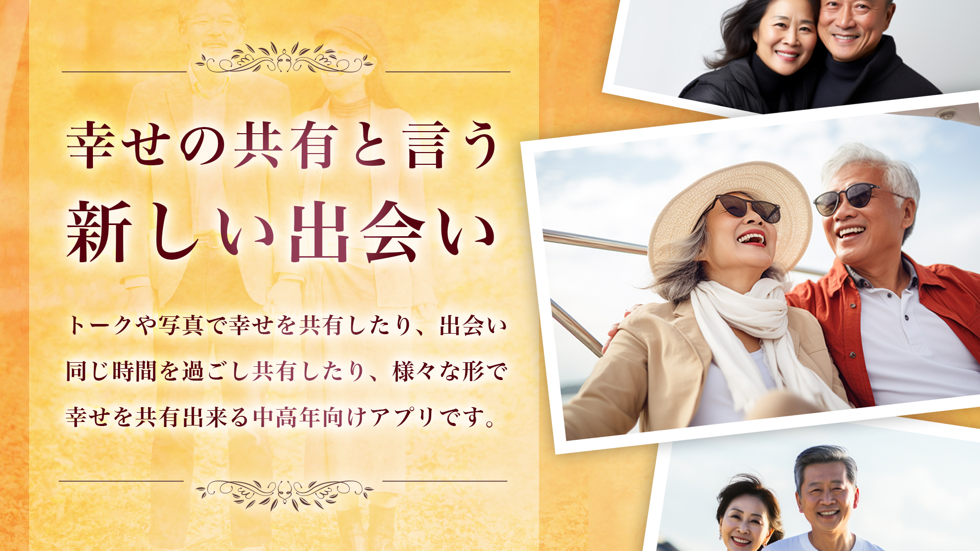 トークや写真で幸せを共有したり、出会い、同じ時間を過ごしたり、様々な形で幸せを共有できる中高年向けアプリです。